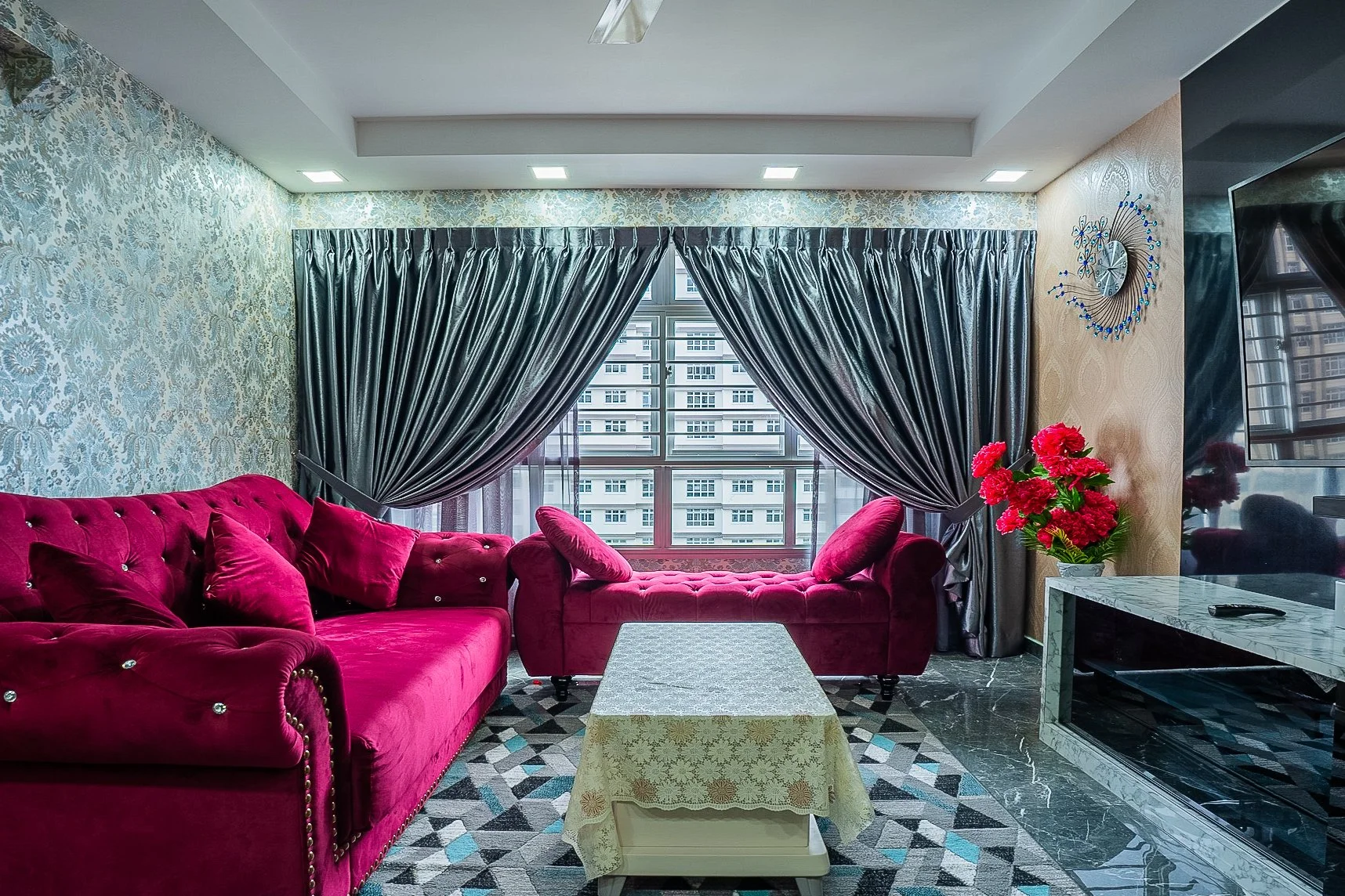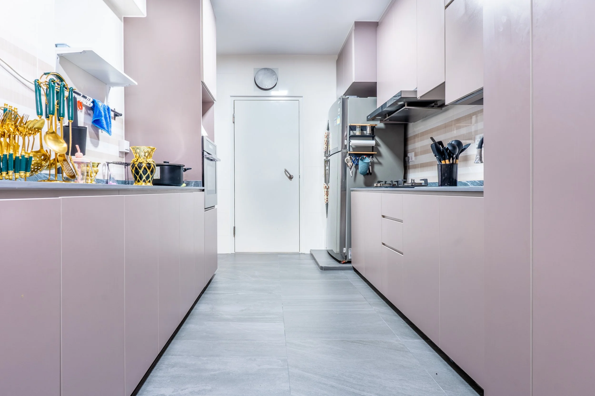 The kitchen stays clean and fuss-free, and the living room’s magenta sofa ties it all together with comfort and personality.