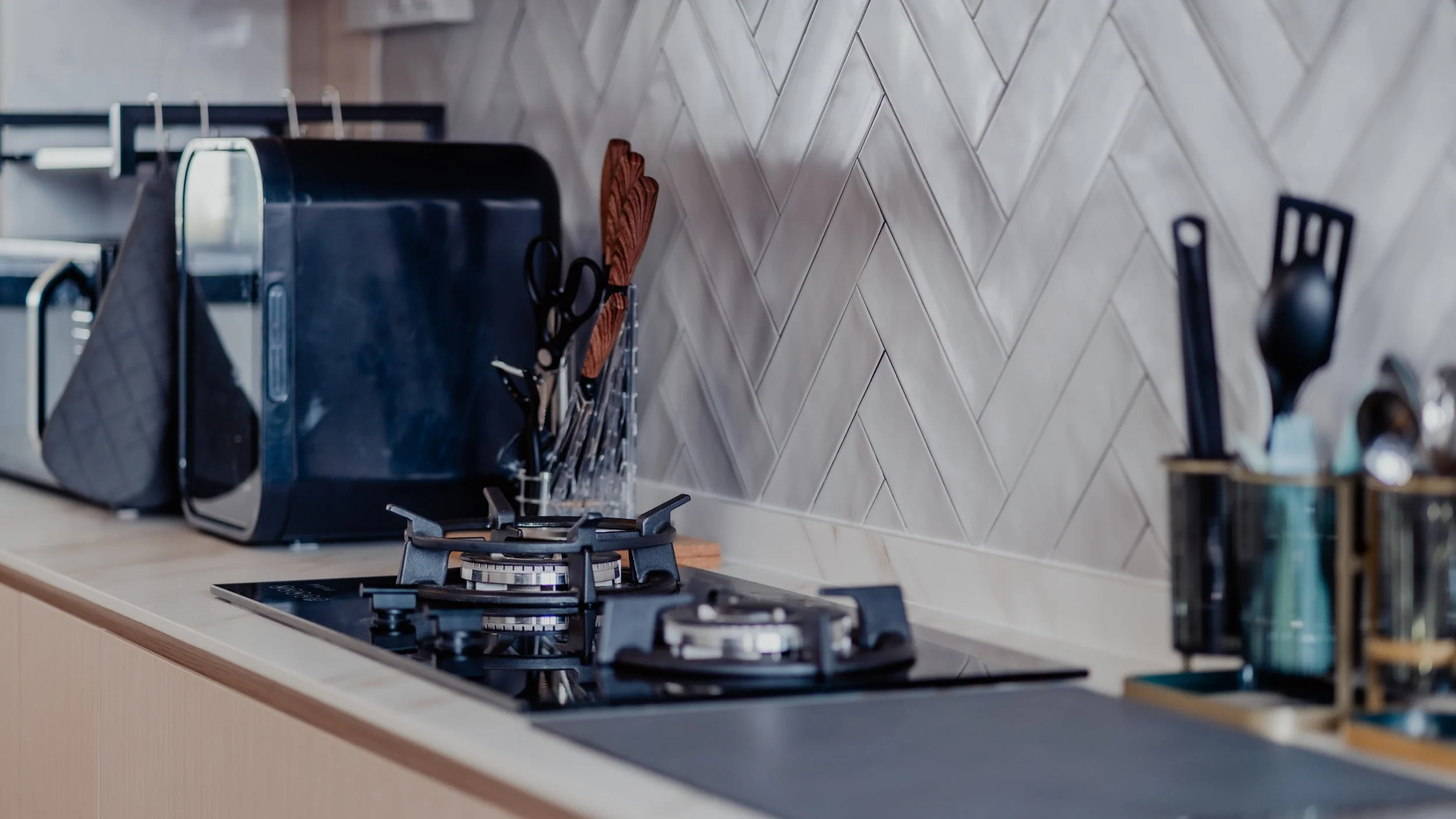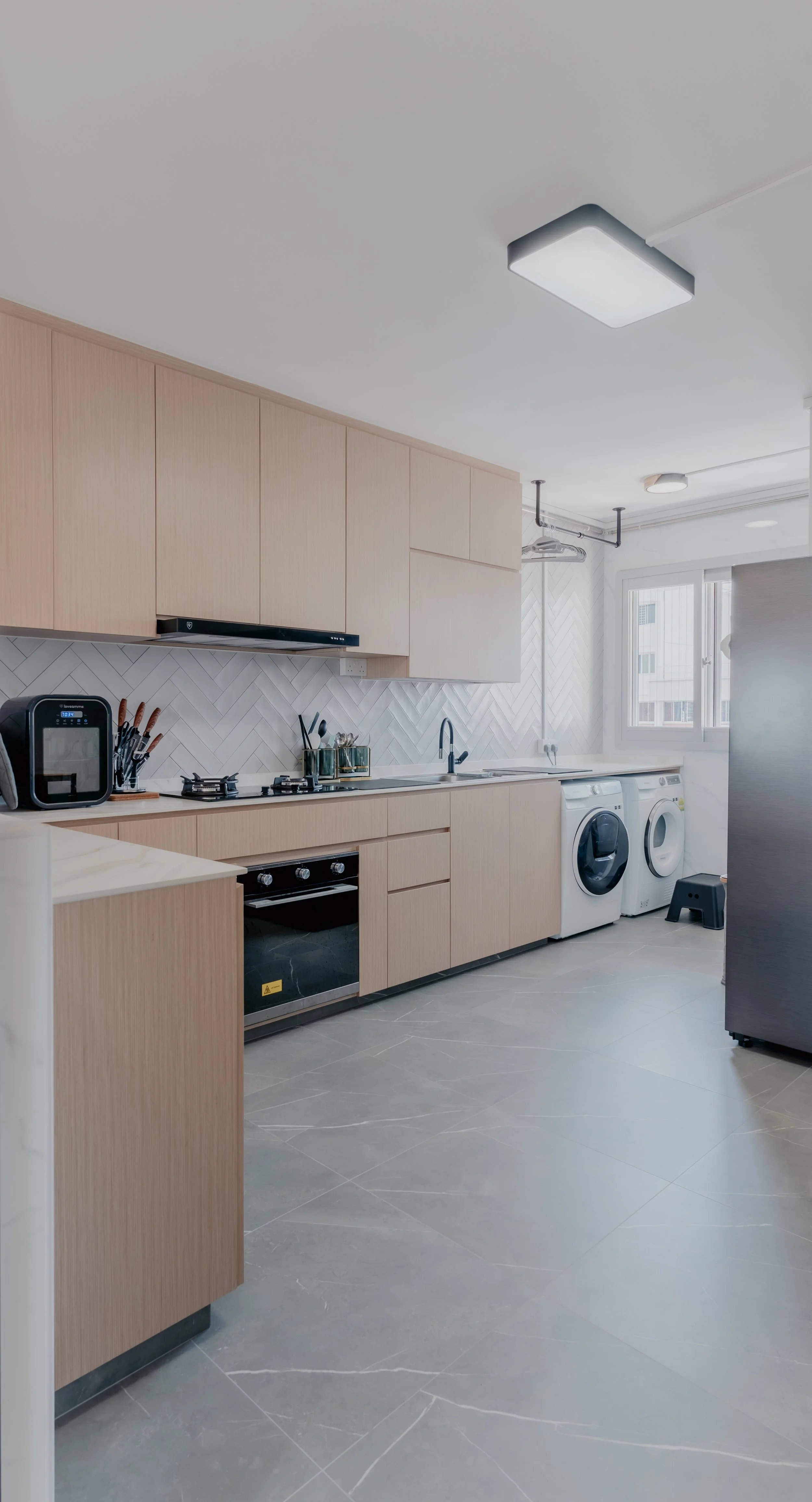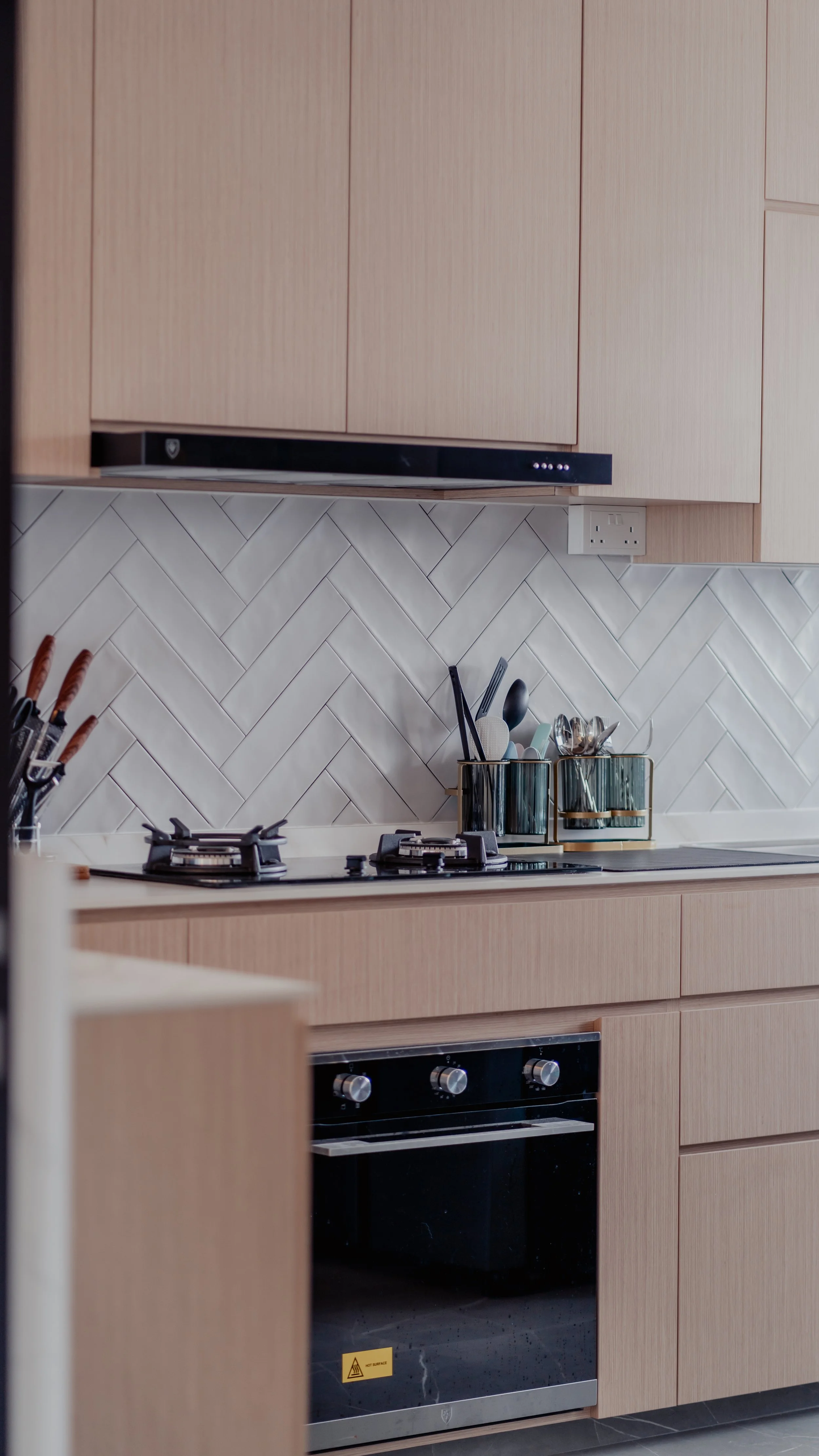 Herringbone tiles add subtle texture in the kitchen, while the bathrooms feature soft wood tones and marble-like walls for a cosy, hotel-inspired feel.