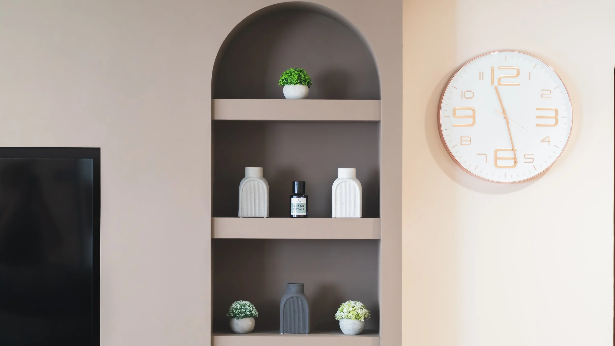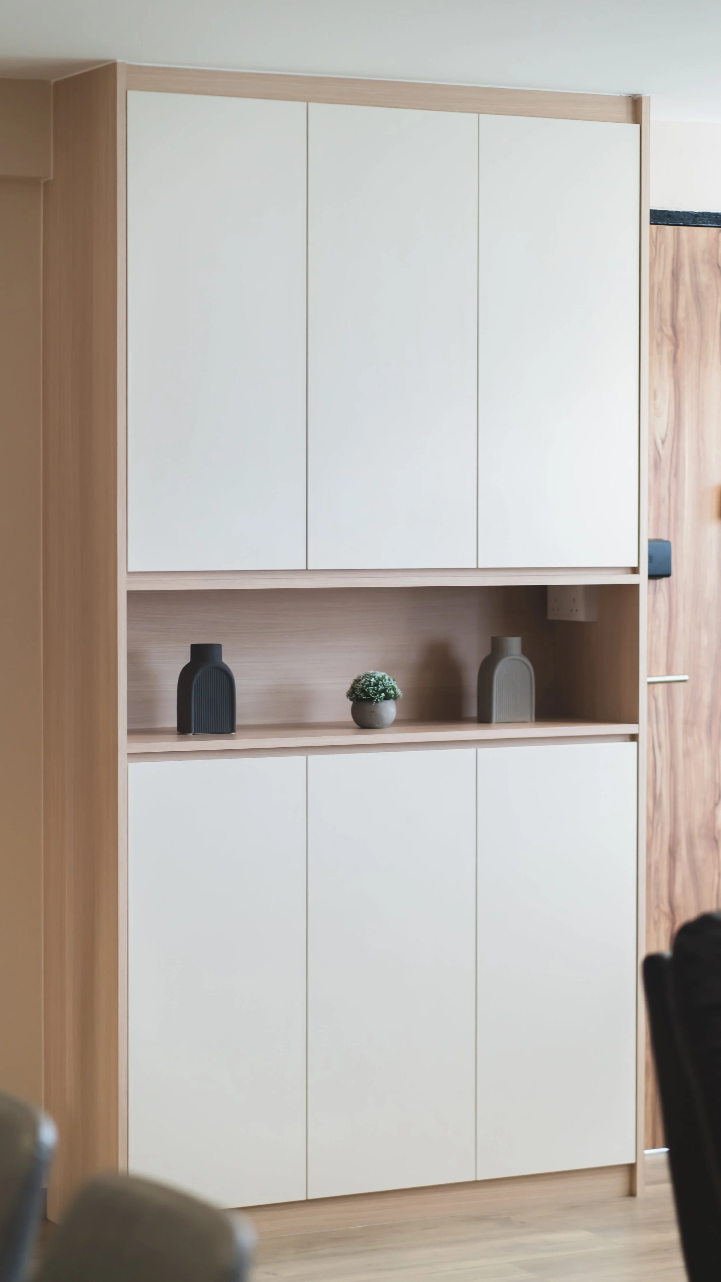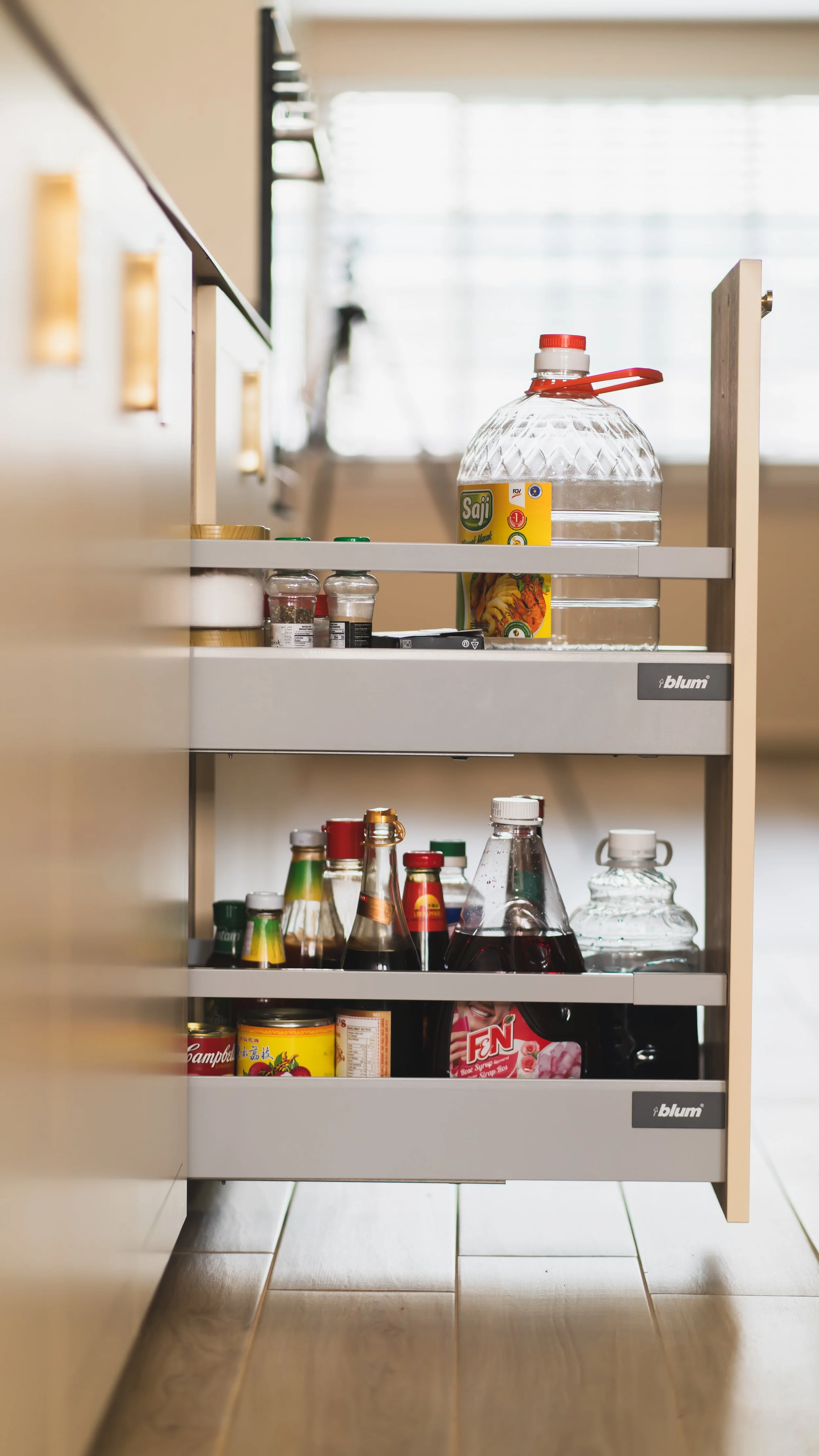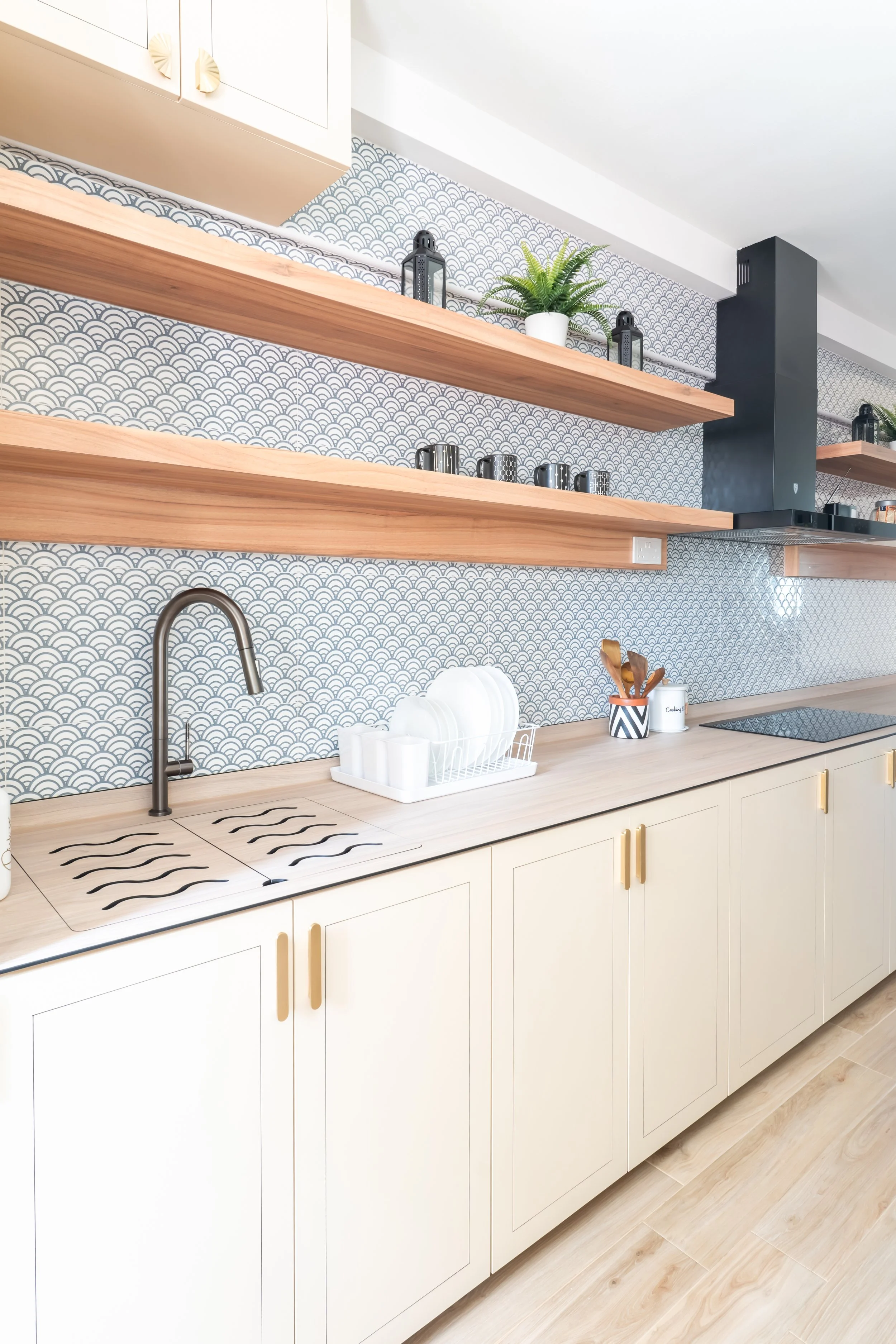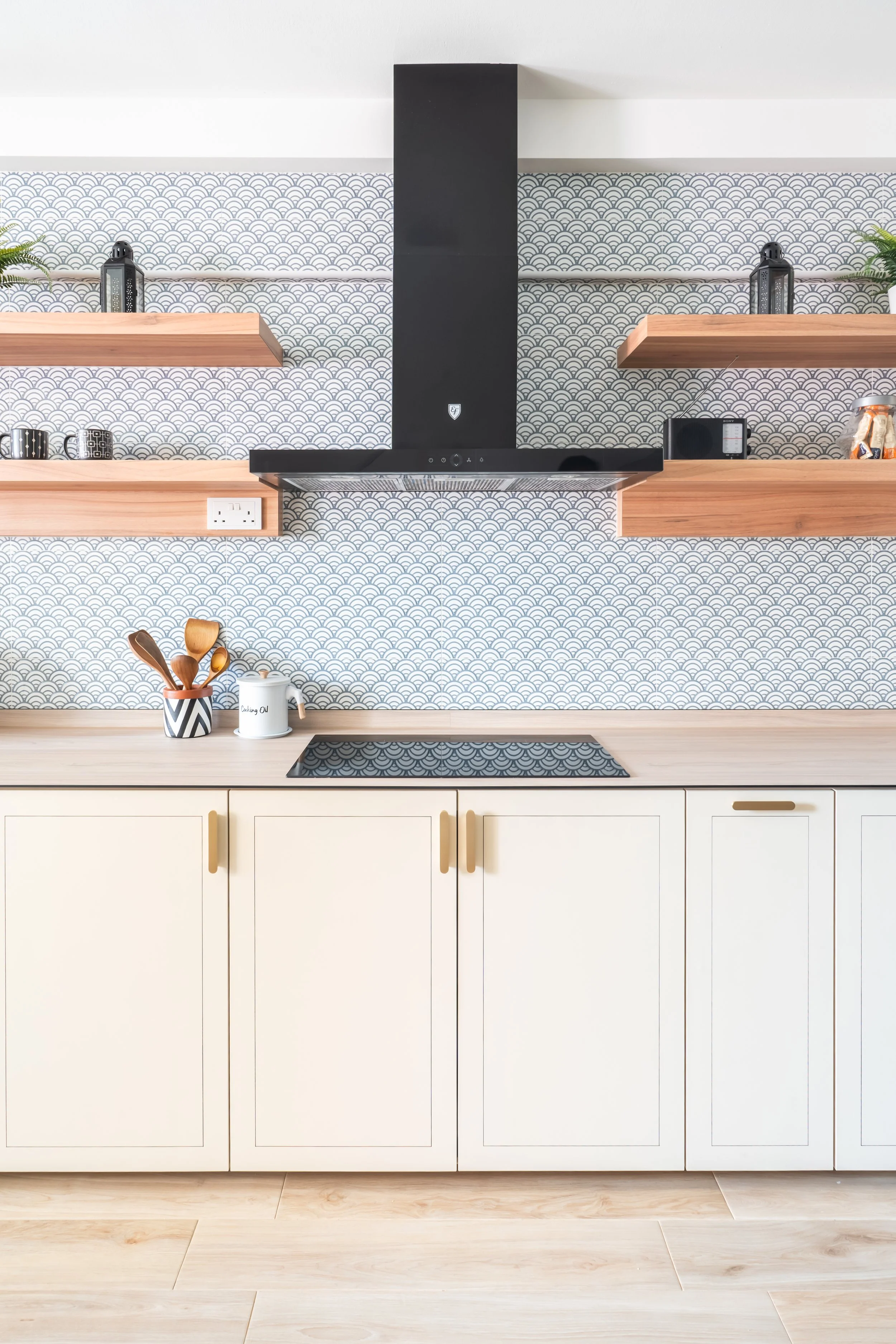 We designed a soft cream-toned kitchen accented with wood shelving, patterned backsplash tiles, and smart storage solutions like Blum pull-outs for sauces and condiments. Built-in cabinets ensure a clutter-free look, while the arched feature shelves in the living area add charm and character. The result is a home that blends functionality with subtle elegance, tailored perfectly to the homeowners’ lifestyle..