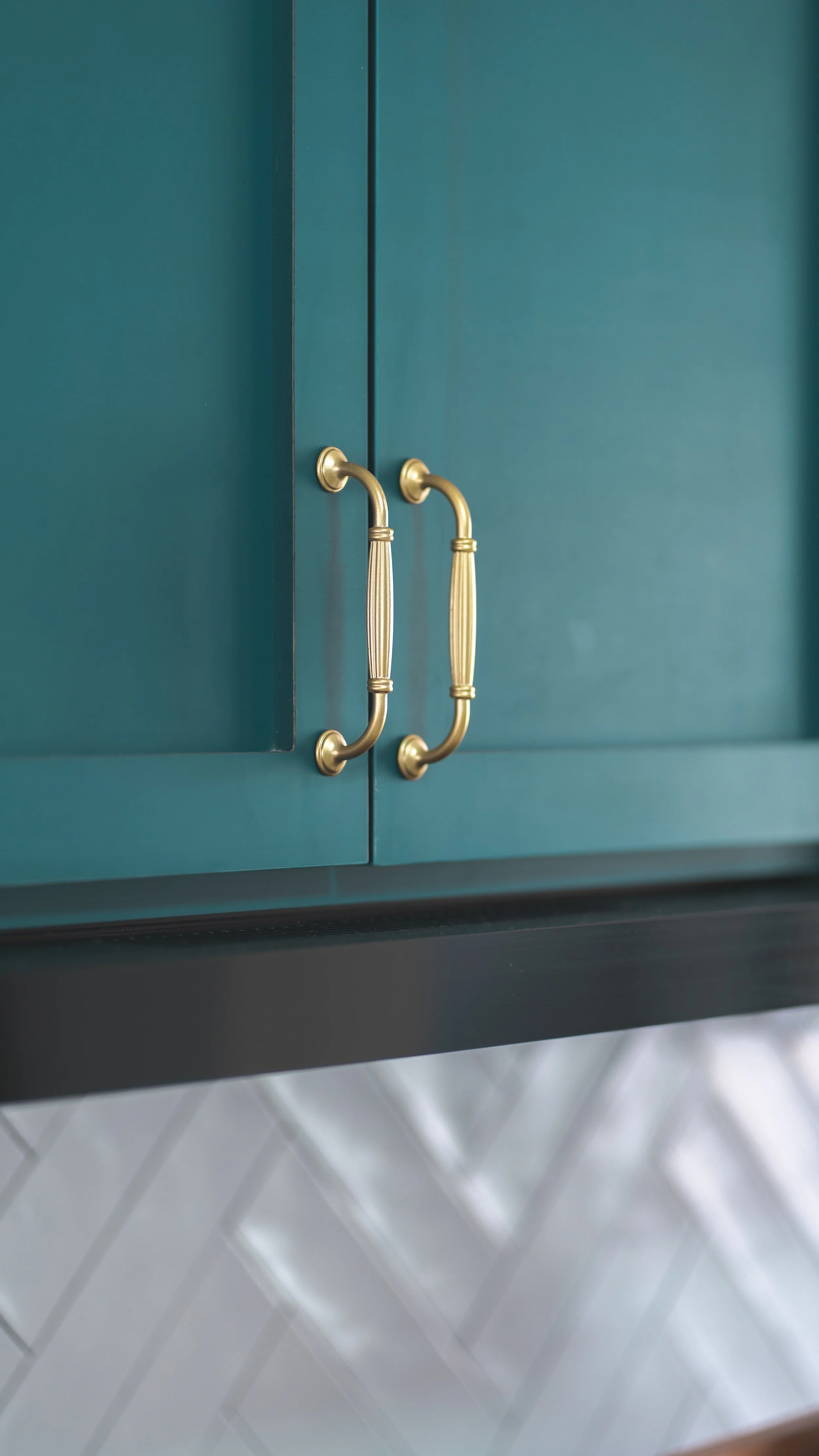 We designed a kitchen with deep teal cabinetry accented by gold handles, paired with a herringbone backsplash for a touch of elegance.