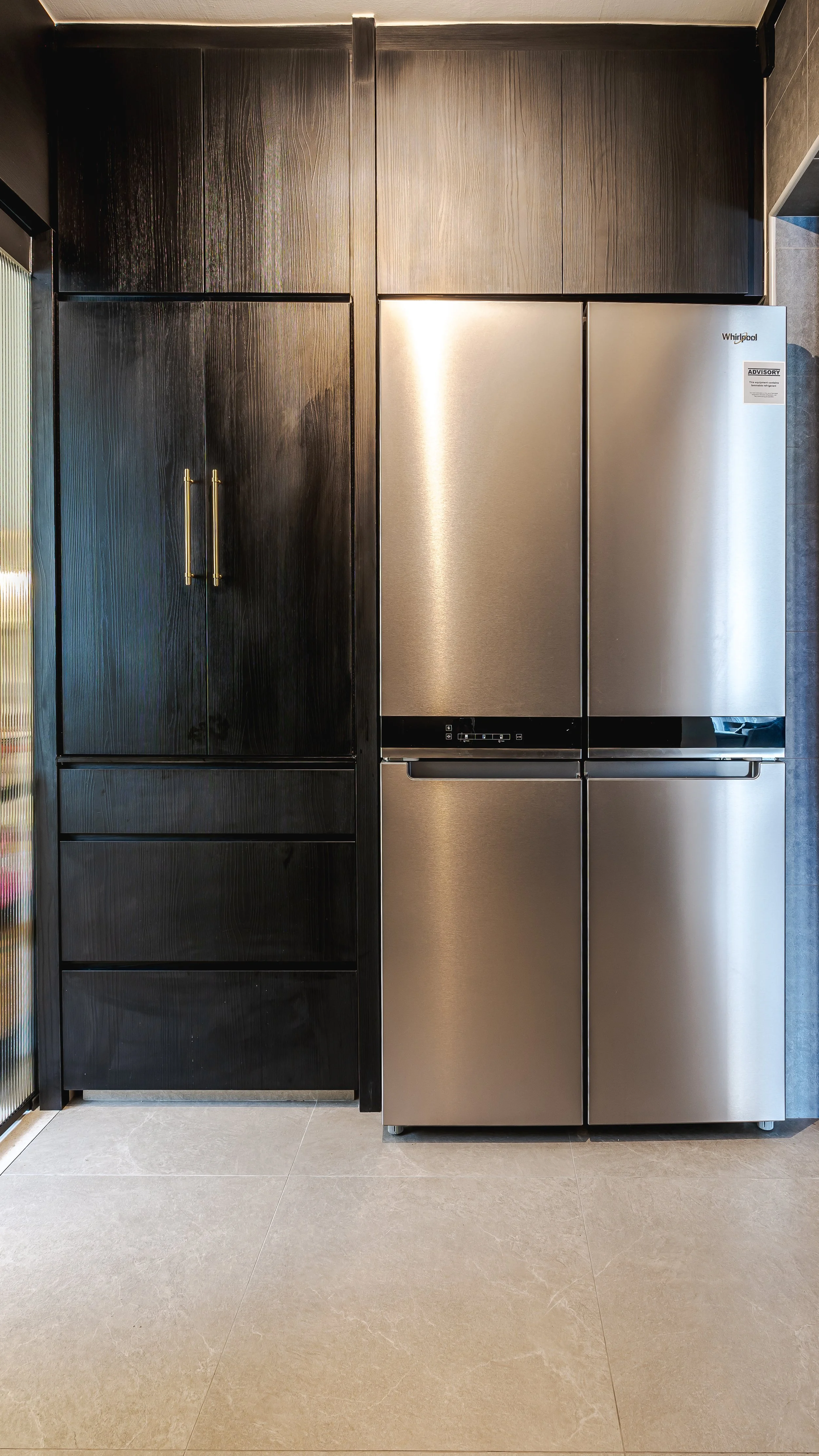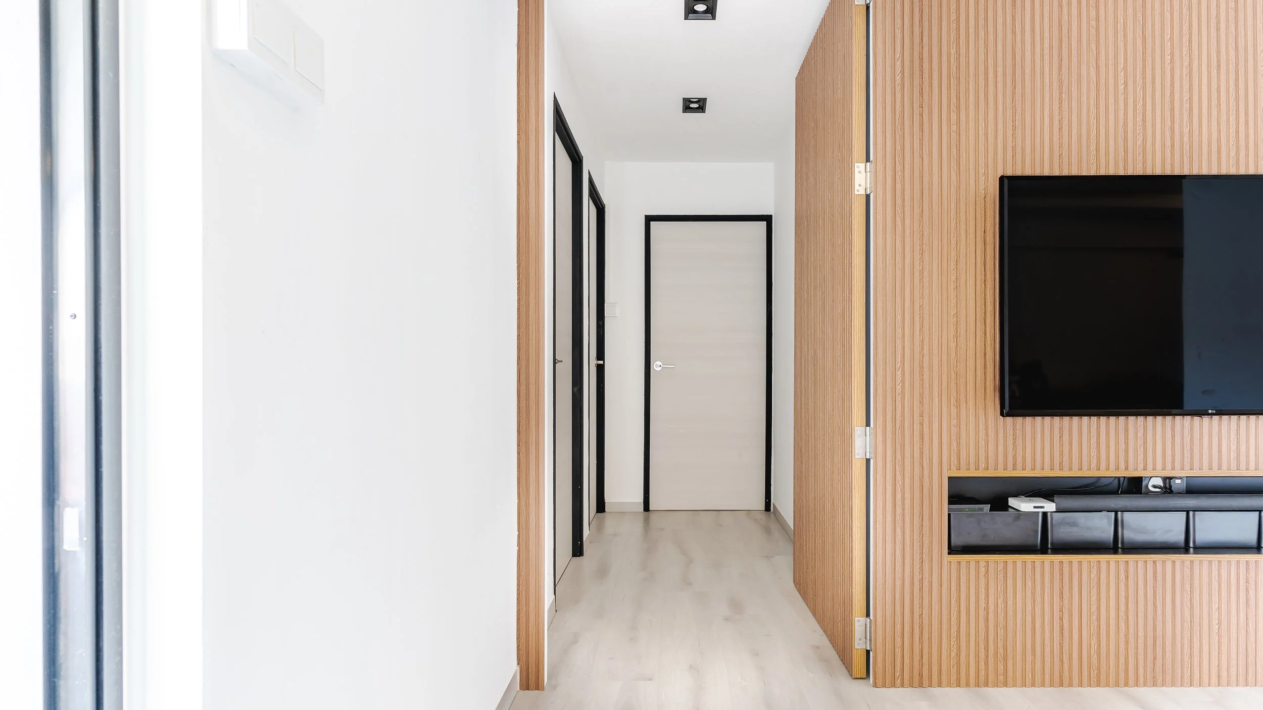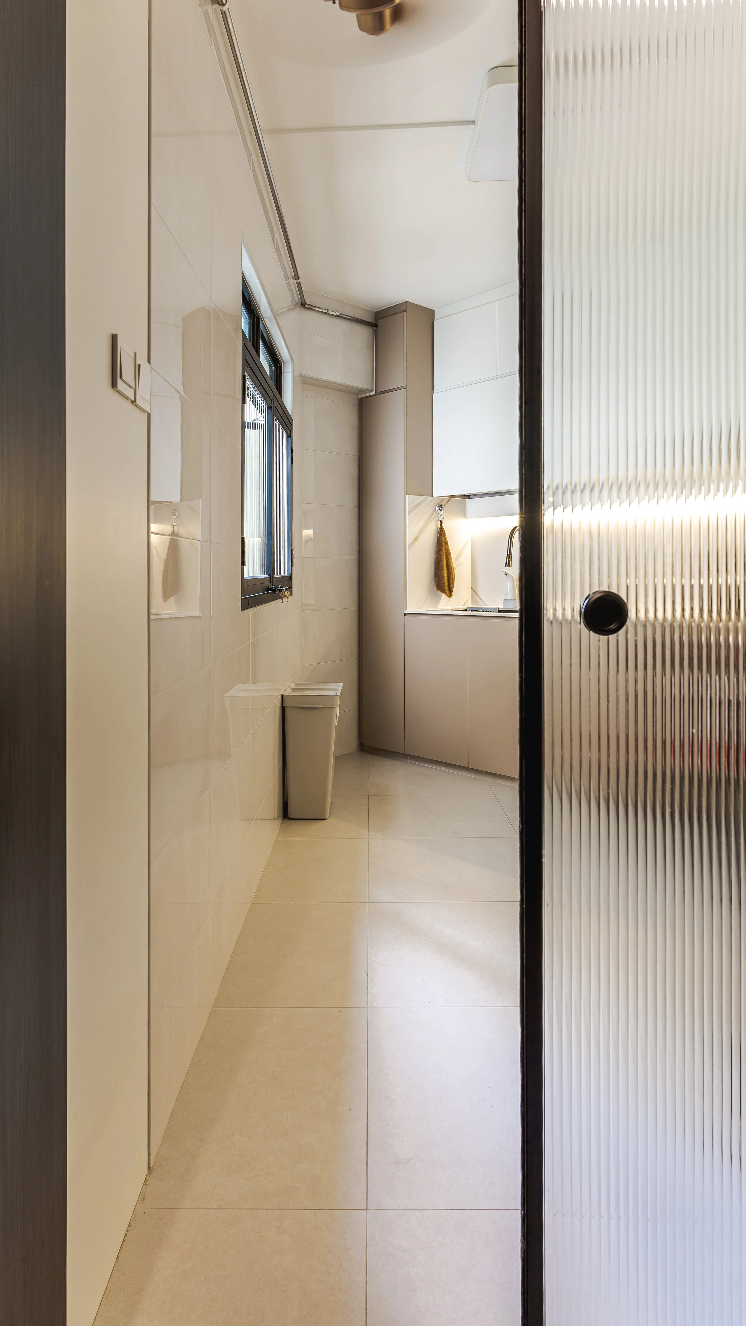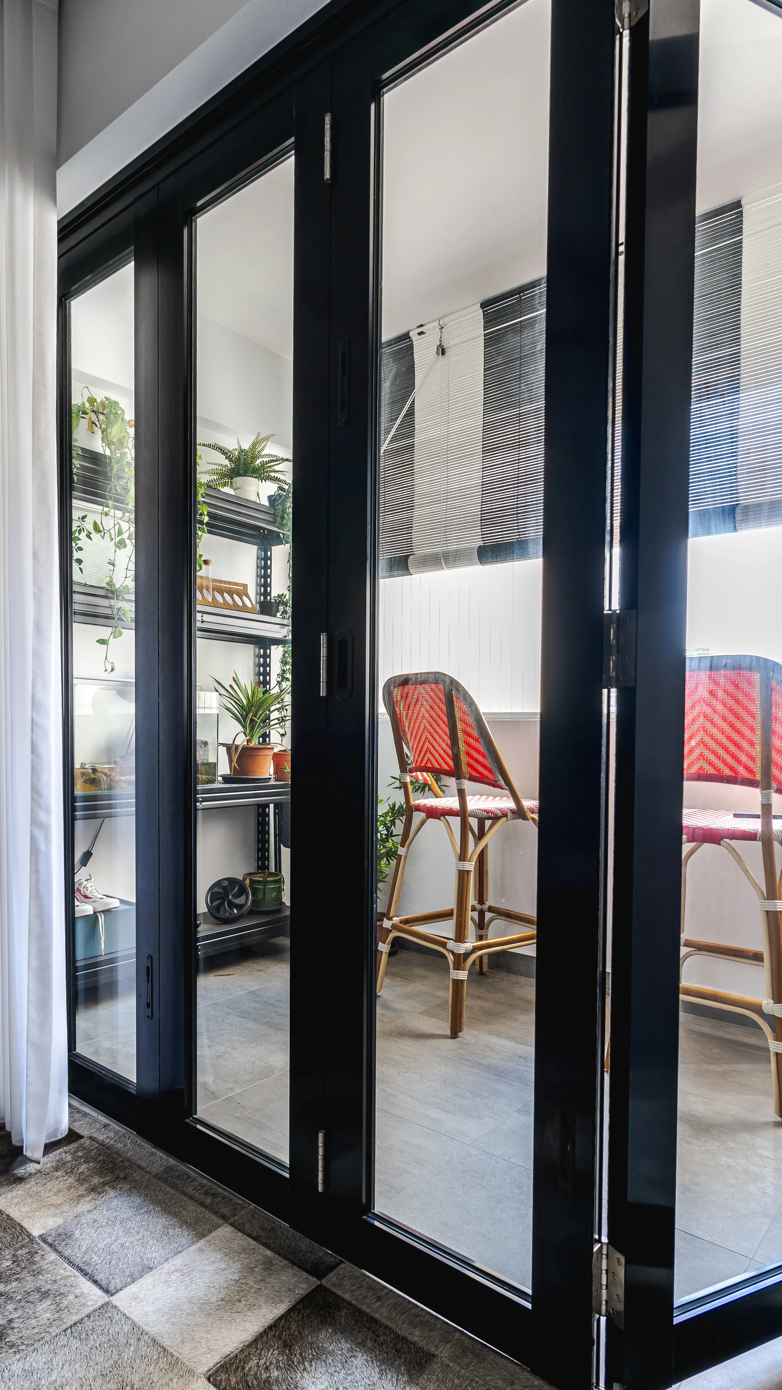 We designed a serene living room with a feature fluted TV wall in warm wood tones, paired with light flooring for balance. The balcony was transformed into a mini green sanctuary, separated with sleek black-framed sliding doors for openness and practicality. A mix of patterned tiles and natural textures ties the look together, creating a modern, refreshing, and homely space.