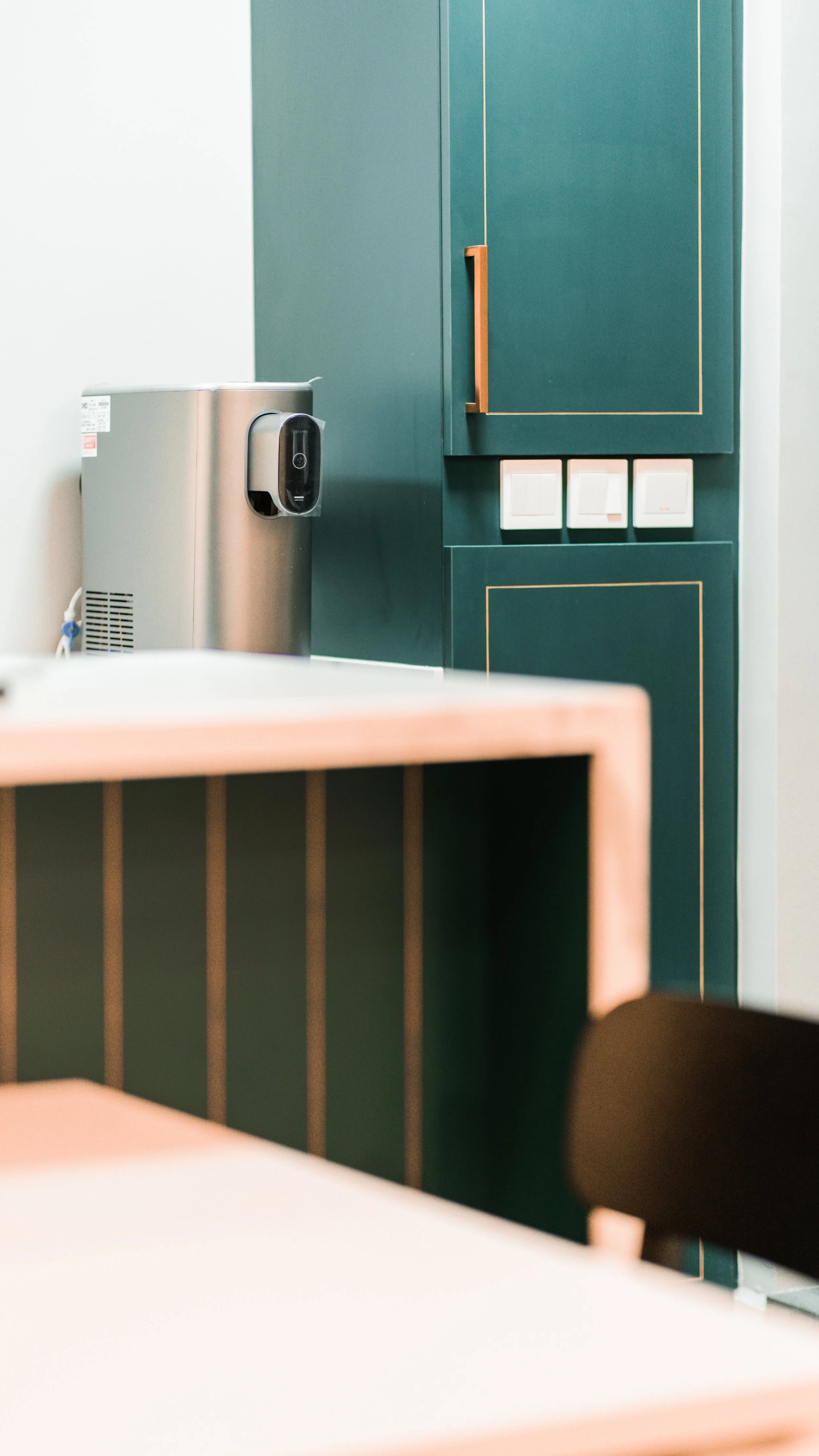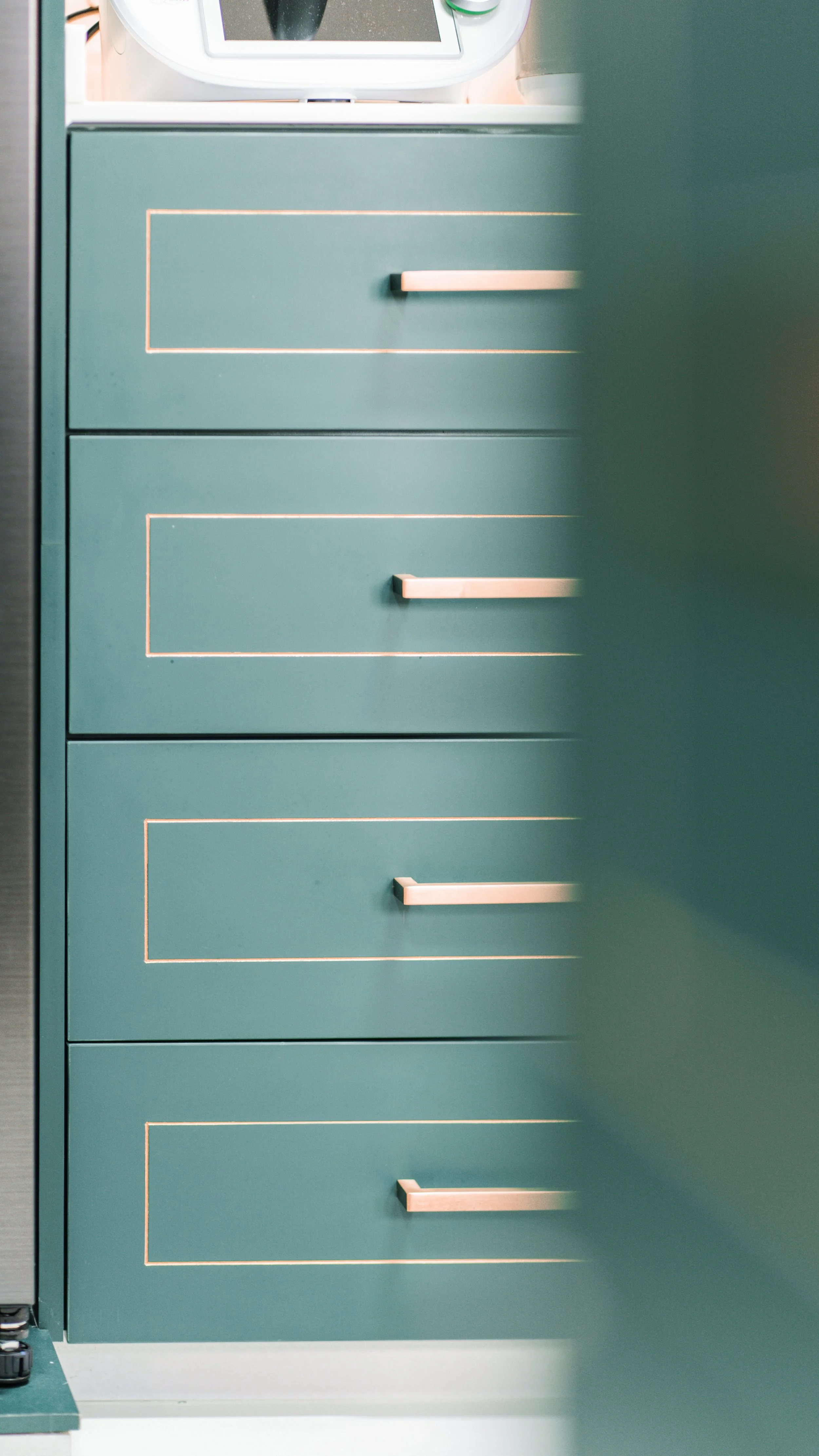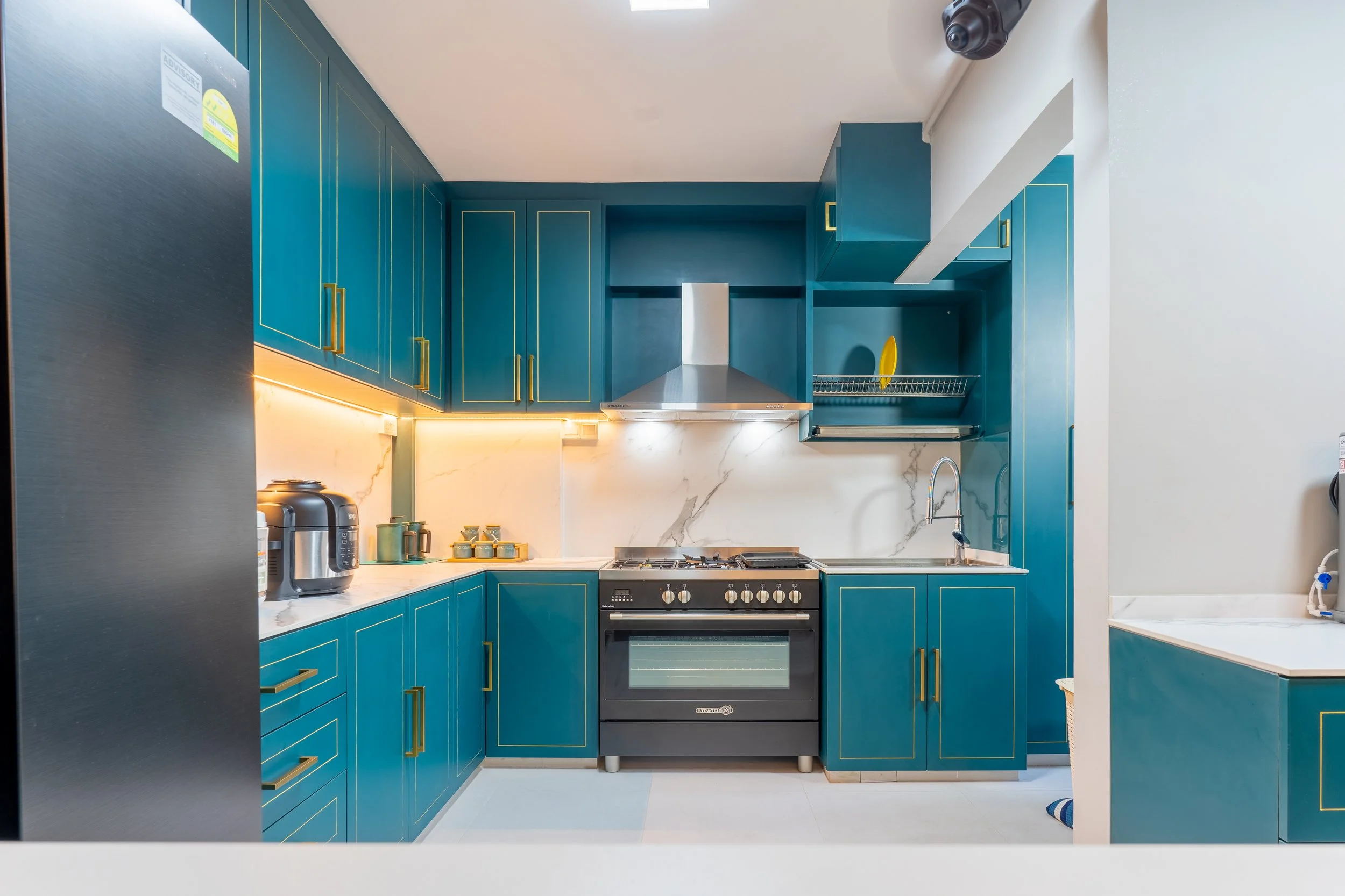 In the kitchen, their request for a striking statement was brought to life with deep teal cabinetry accented by gold handles, complemented with marble-effect countertops and warm under-cabinet lighting. The overall look balances elegance and functionality, blending bright, airy tones in the living space with a rich, luxurious kitchen palette that elevates everyday living—all while keeping the home practical for daily use.