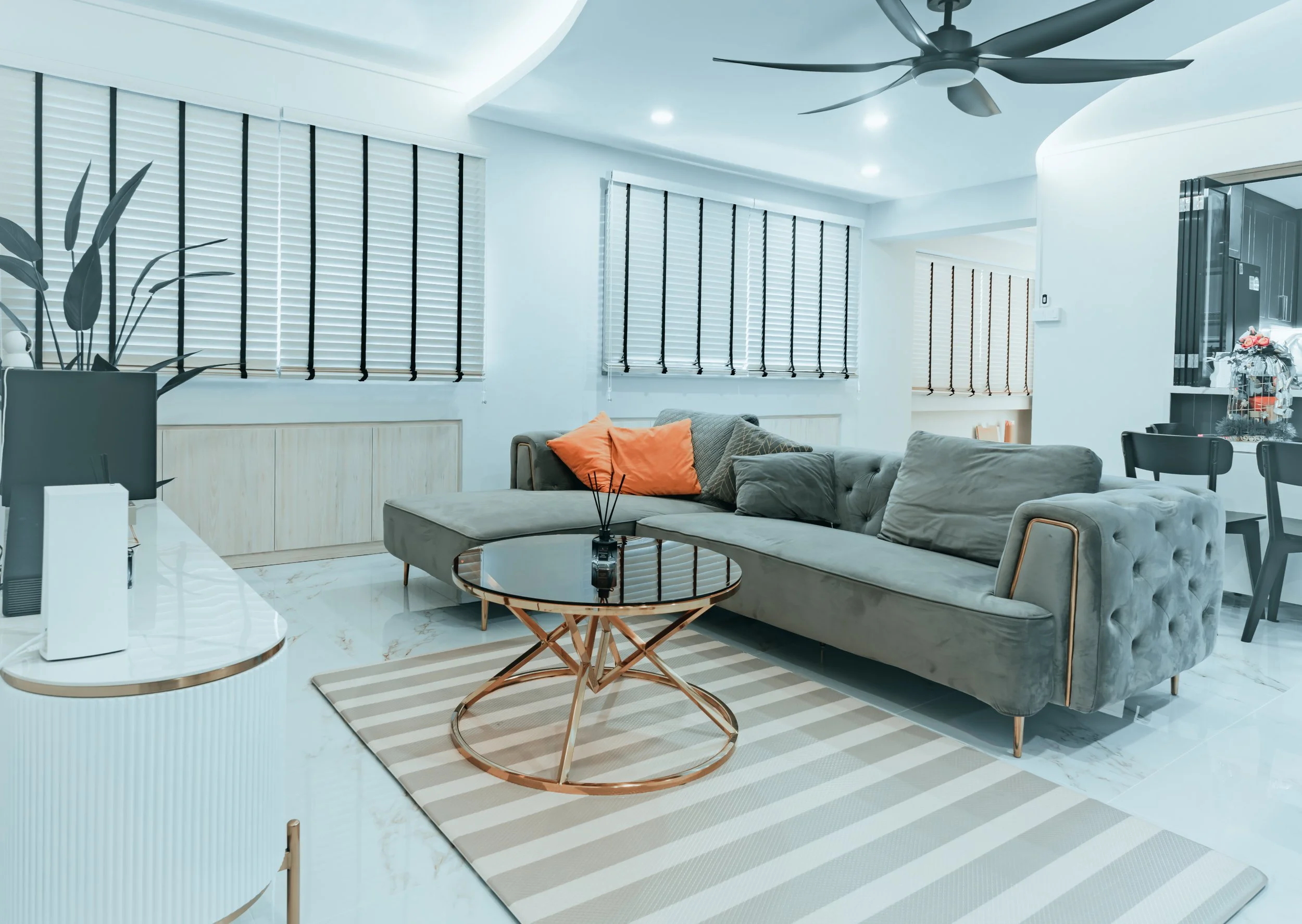 The homeowners wanted a modern yet cozy design with bold character. We crafted a clean living area with a custom arched TV feature wall, paired with a plush sofa and layered textures for warmth.